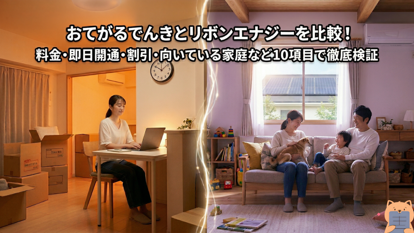 どちらが正解かは家庭環境・ライフスタイルによって異なります。持ち家・オール電化・太陽光・ペット飼育など割引条件が重なるファミリー世帯ならリボンエナジーを、引越し直後・賃貸一人暮らし・夜型生活・電気代を予測したい人にはおてがるでんきをおすすめします。